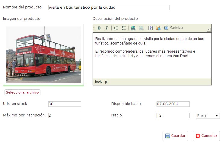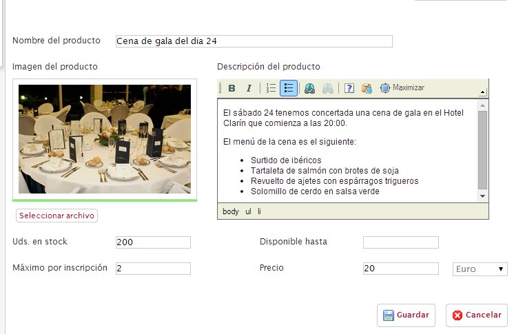 Una vez entramos en la herramienta podemos añadir nuevos productos indicando su nombre, una imagen que queramos asociar, una descripción del mismo, unidades en stock, número máximo por inscripción, fecha de disponibilidad y el precio.